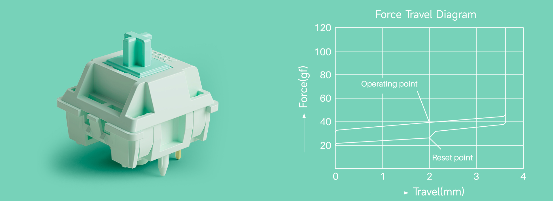 El switch cuenta con un vástago personalizado de Nylon (Pro), una cubierta superior de PA12 y una carcasa inferior de PA6, lo que genera una combinación única de materiales que optimizan la experiencia de escritura. Es un diseño de 5 pines, compatible con keycaps de estructura estándar MX.