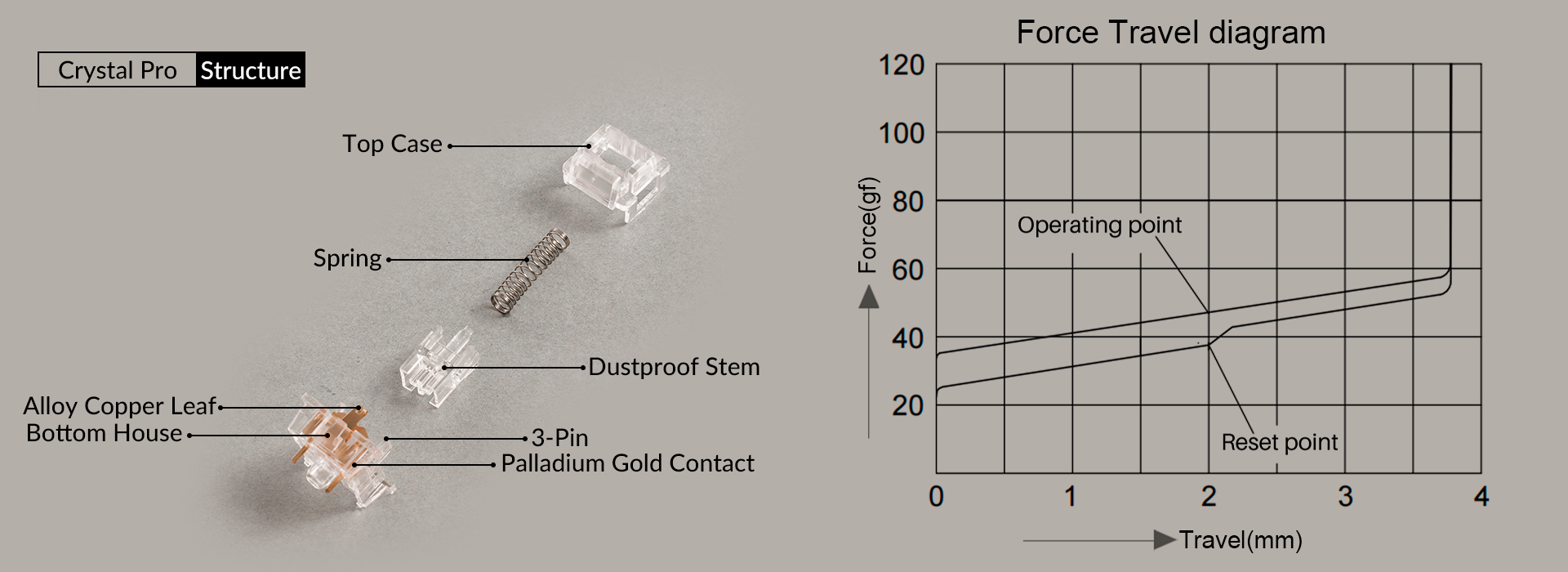 Equipado con un resorte de extensión de 18 mm, el Crystal Pro ofrece una fuerza de actuación clásica de 45gf, ideal para quienes buscan una experiencia de escritura suave y silenciosa, perfecta para cualquier teclado custom.